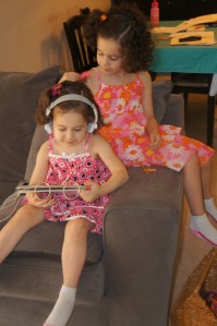 I love this picture I took randomly this summer. The girls were “playing homeschool.” The youngest (age 4) was listening to the Addition Fact songs on the iPod (what our older is dealing with in math right now), and the older was playing teacher and beauty parlor at the same time. Yup. This is what homeschooling really looks like!