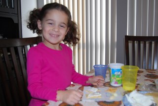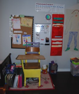 Above you can see our bulletin boards, and some of my oldest’s work I’ve hung up on the wall: her self-portrait showing her senses, her turtle, etc. To the left of her desk are my file bins, and to the right is a little garbage can (made out of a plastic coffee container- one day I’ll mod podge or something and make it cute) and little shelves holding her