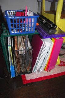 Lil’ Carry All with all of her supplies, and the bottom shelf holds her Couisinaire rods that we use on a regular basis. Inside the desk cubby is construction paper and coloring books to keep Lily occupied when she’s home with us. The rug is there to keep the chair from scratching our hardwood floors.