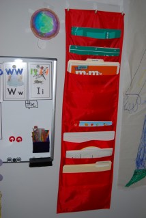 Here is the wall pocket hanger I got on sale at Staples. I use it to hold all of our “active” work, our math books and various materials, our library books, and unit folder.